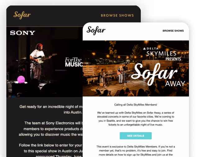 Leverage Sofar’s high-intent, music-loving audience through targeted email campaigns that drive awareness, action, and loyalty.
